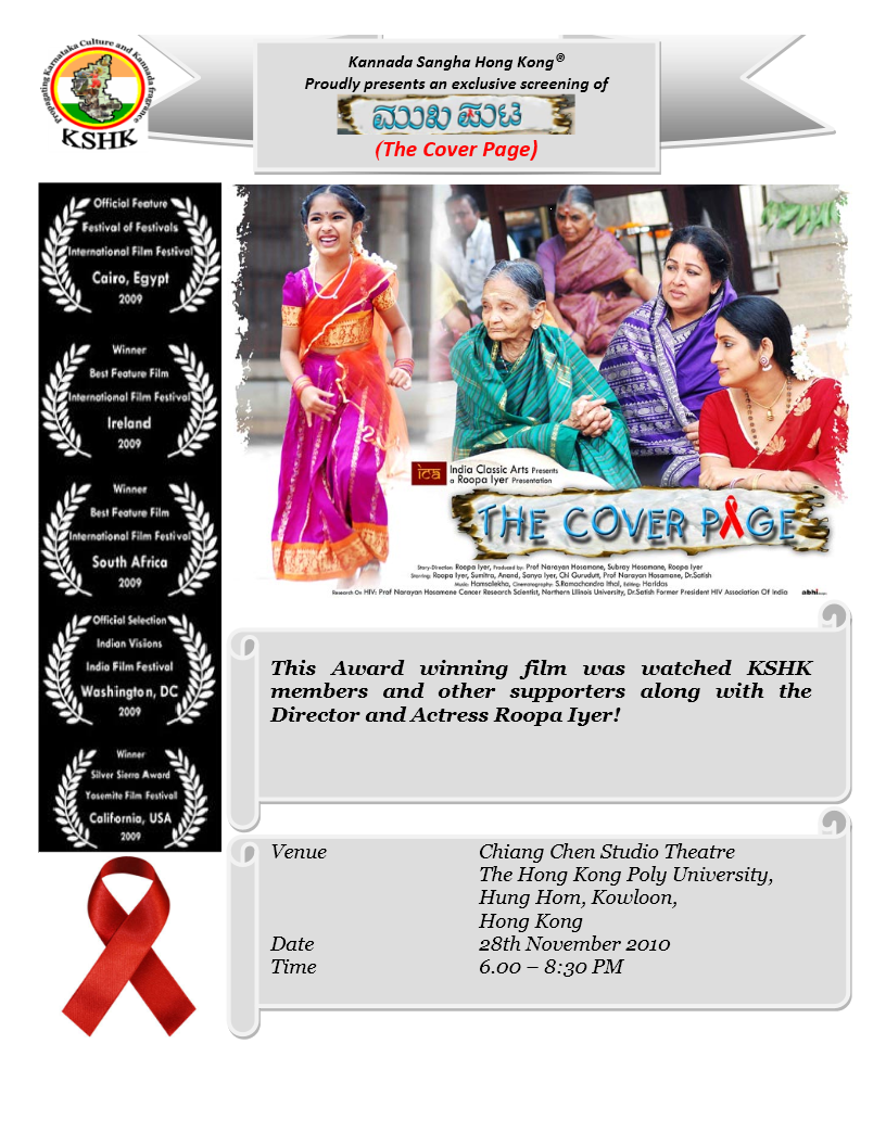 To mark World Aids day on 1st December 2010, and to draw attention and support for the challenges faced by HIV affected people in India, Kannada Sangha Hong Kong (KSHK), arranged for the screening of the International award winning film Mukhaputa in Hong Kong.